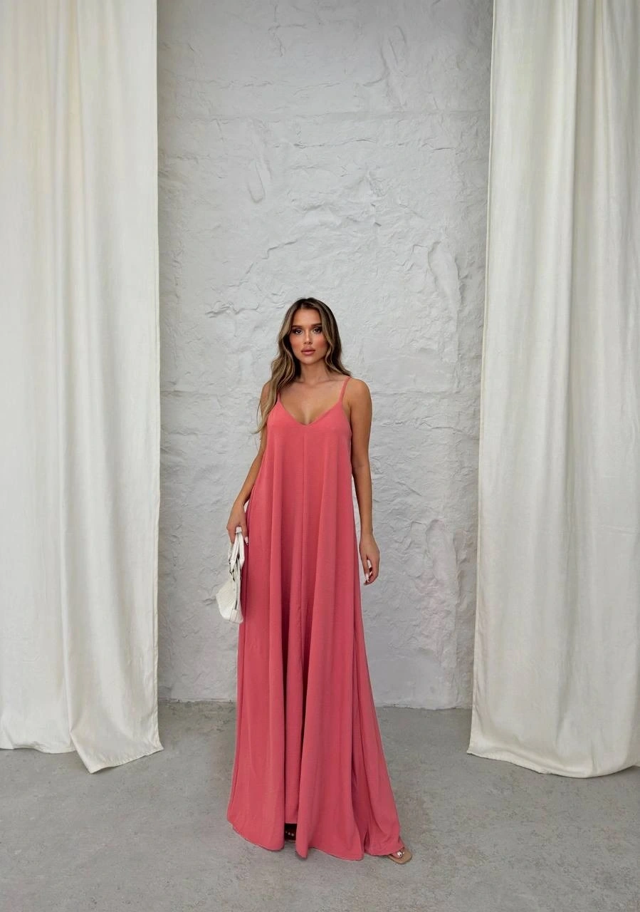 Aerobin uzun elbise, feminen ve şık bir görünüm sunar. Siyah düğme detaylarıyla hareketlendirilmiş olan bu pembe elbise, günlük giyimden özel davetlere kadar geniş bir kullanım alanı sunar.