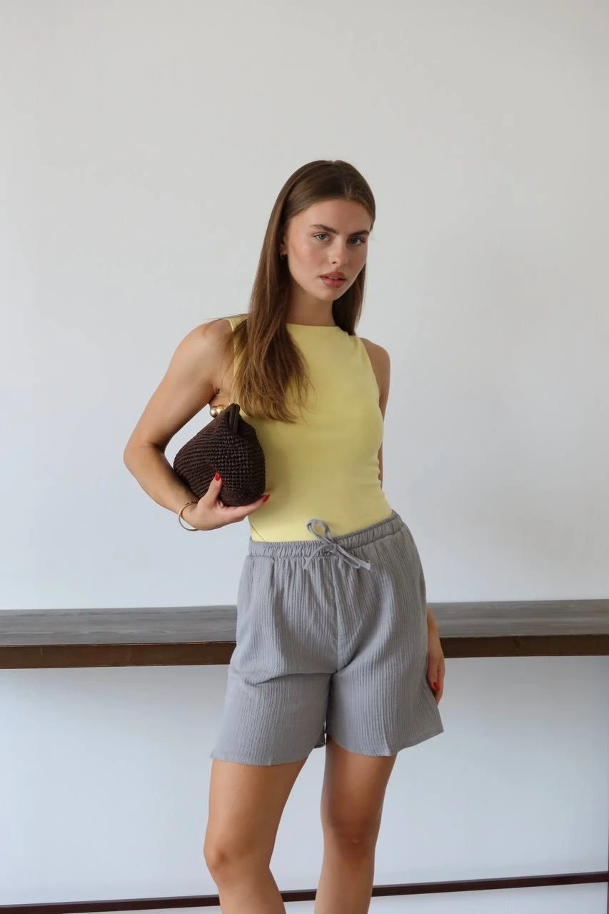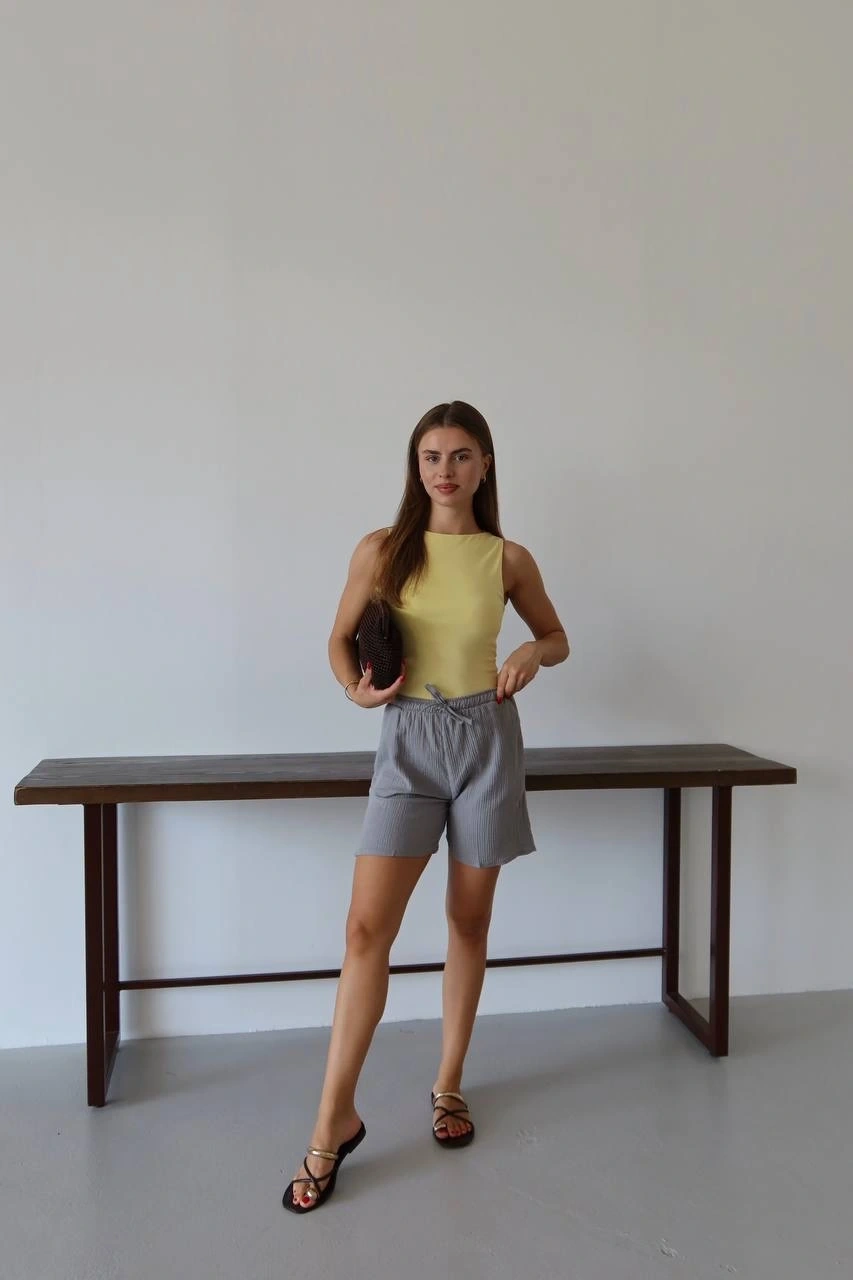 Modayı takip eden ve rahatlıktan ödün vermeyen kadınların tercihi Müslin Kumaş Şort Bağcıklı Gri PT ile stilinizi tamamlayın!