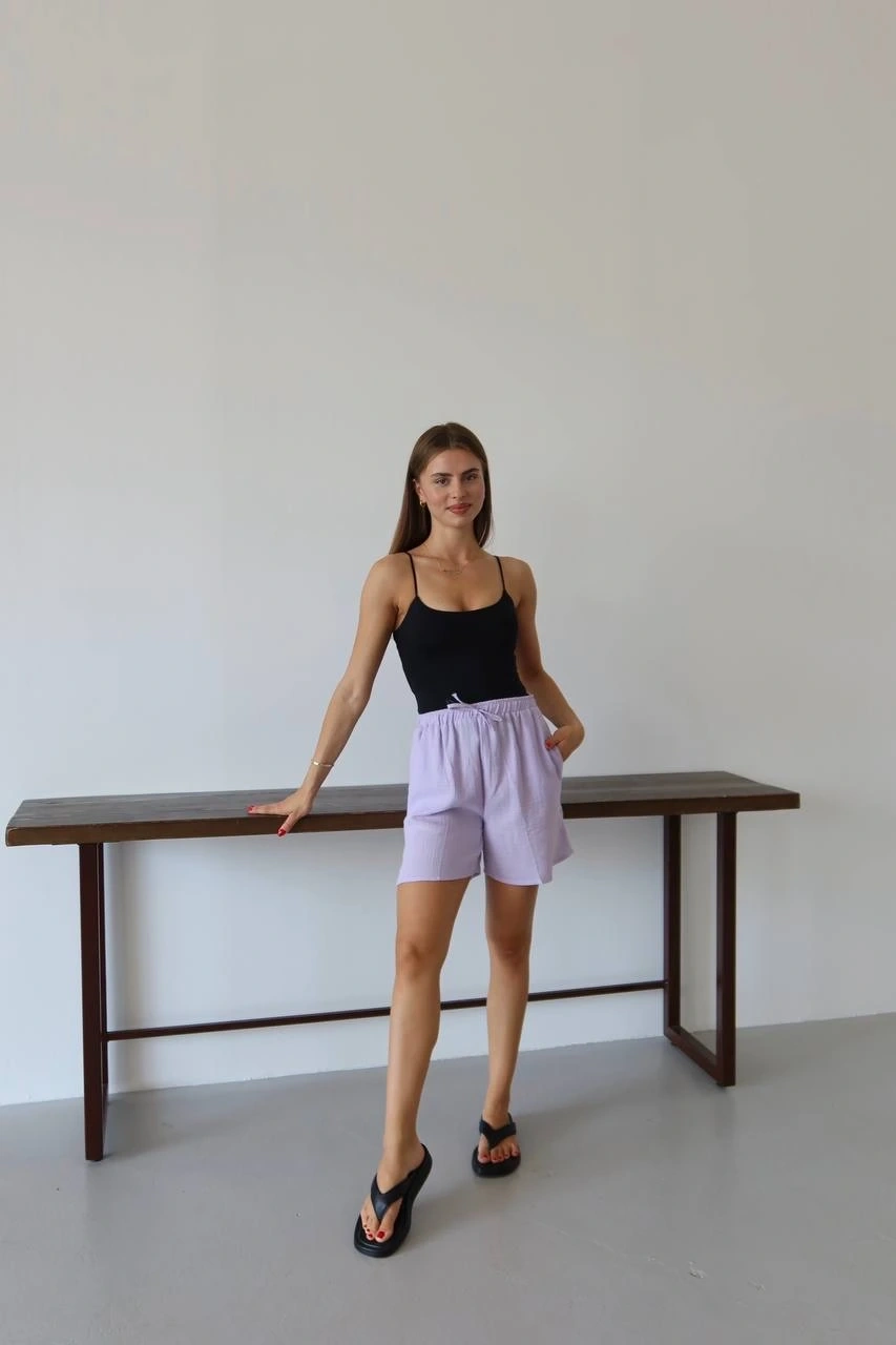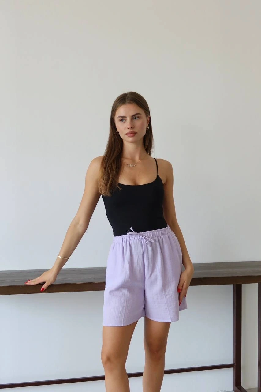 Müslin Kumaş Şort Bağcıklı Lila PT, gardırobunuzun vazgeçilmez parçası olmaya aday! Rahatlığı ve şıklığı bir arada sunan bu şort ile şıklığı yakalayacaksınız.