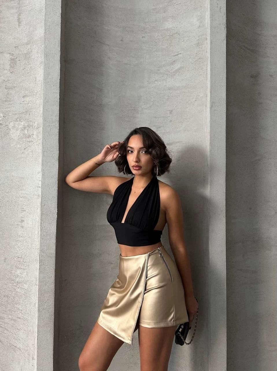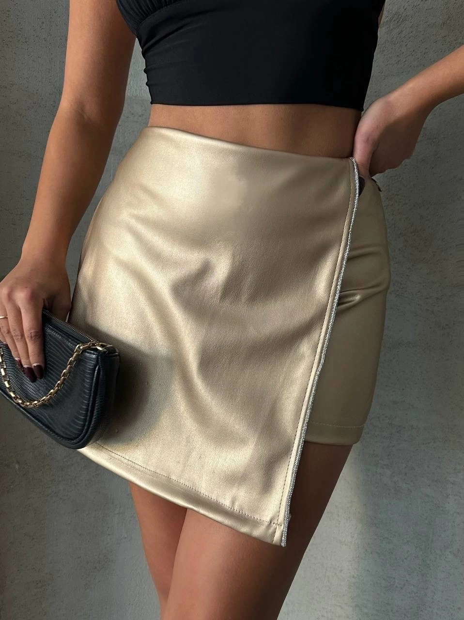 Şıklık ve rahatlığı bir arada sunan Taşlı Şort Etek Deri Gold H240018 ile tarzınızı konuşturun.