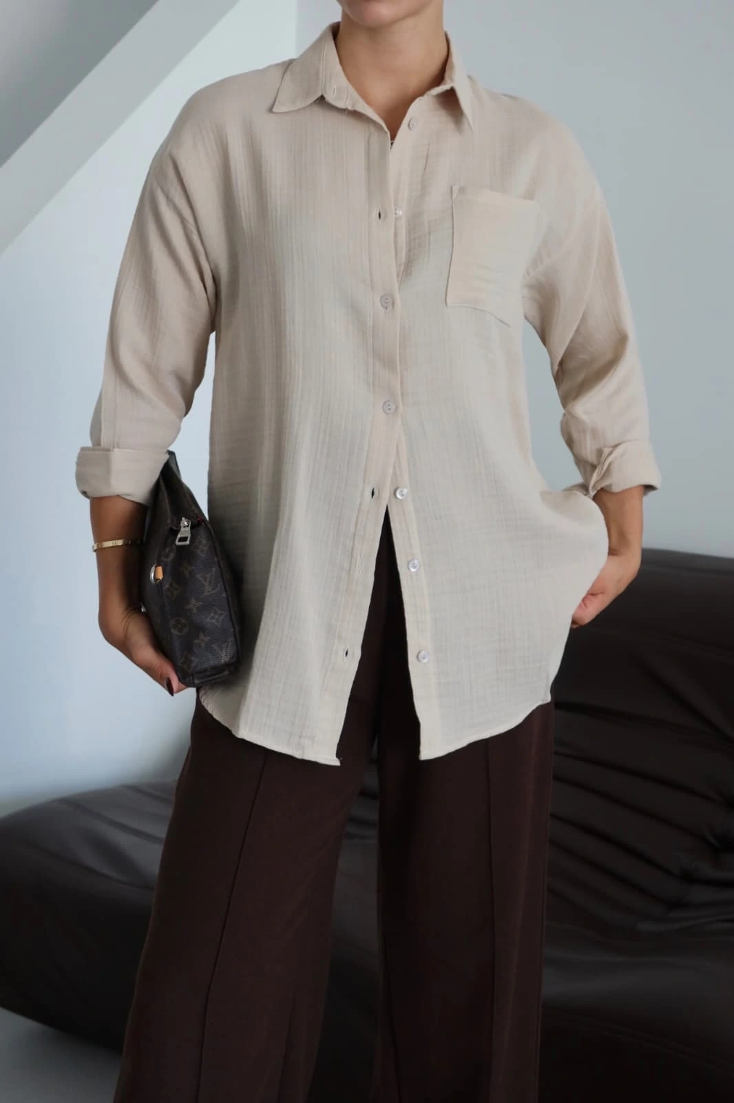 Tek Cepli Müslin Gömlek Bej PT, şık ve rahat tasarımıyla öne çıkıyor. Hem günlük kullanıma hem de özel günlerde tercih edebileceğiniz şık bir parça.