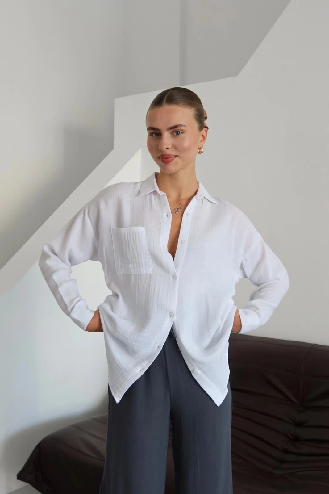 Günlük hayatta ya da özel davetlerde kolaylıkla kombinleyebileceğiniz beyaz tek cepli müslin gömlek, şıklığı ve rahatlığı bir arada arayan kadınların tercihi olacak.