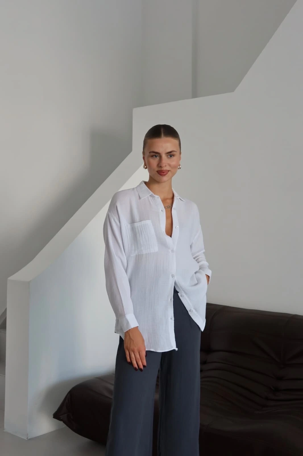 Beyazın sadeliği ve şıklığı ile tek cepli müslin gömlek, günlük şıklığınızı tamamlamak için ideal bir seçenektir.