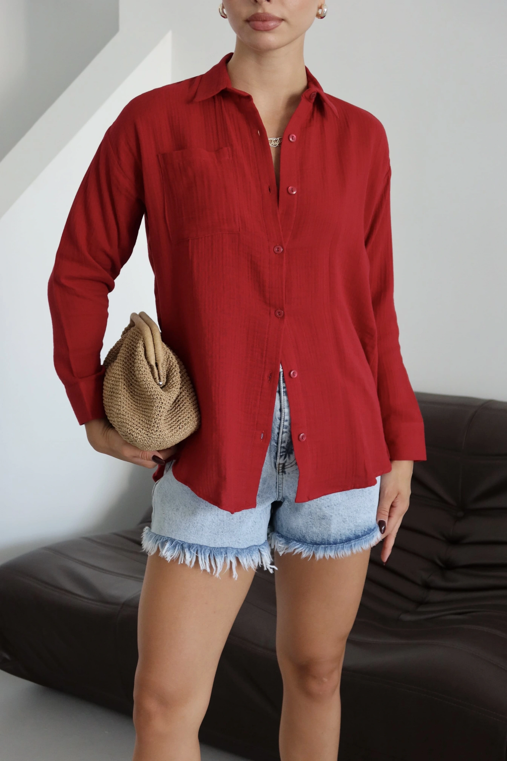 Şıklığı ve rahatlığı bir arada sunan Tek Cep Müslin Gömlek ile tarzınızı ön plana çıkarın. Bordo rengi ile dikkat çeken gömlek, şık detaylarıyla göz kamaştırıyor.