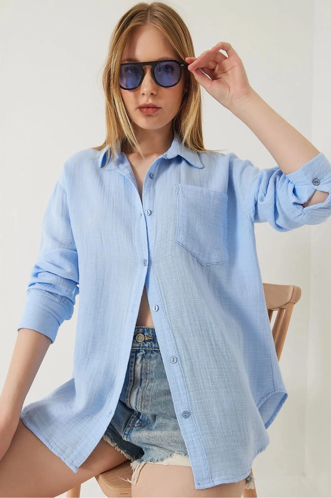 Bu mavi tek cepli müslin gömlek, gardırobunuzun vazgeçilmezi olmaya aday! Zarif tasarımı ve rahat kesimiyle şıklığı ve konforu bir arada sunar.