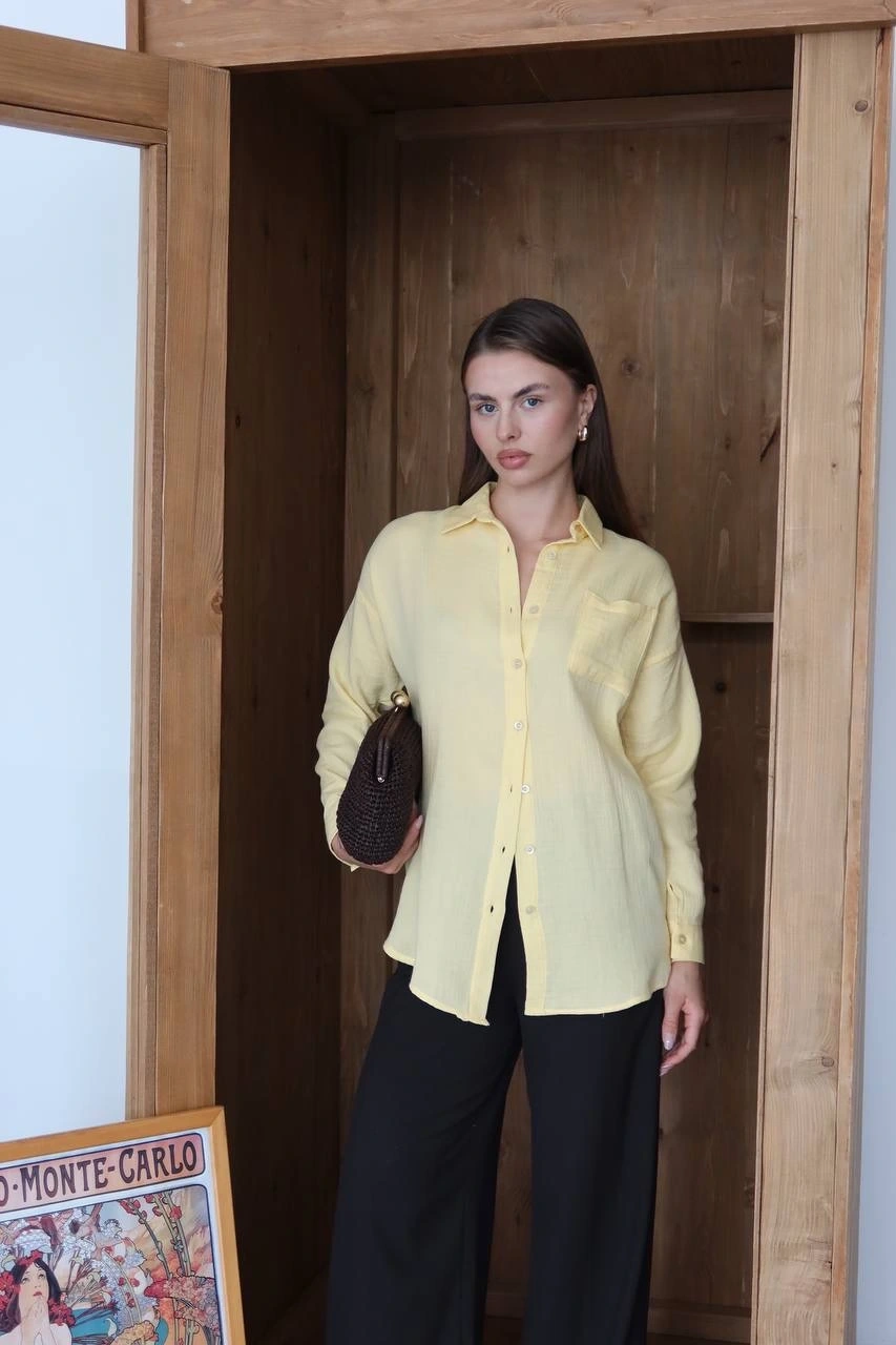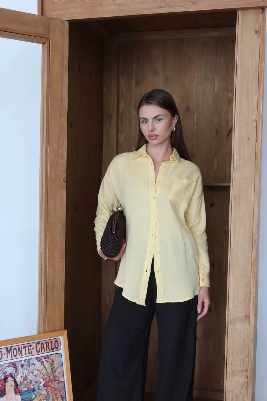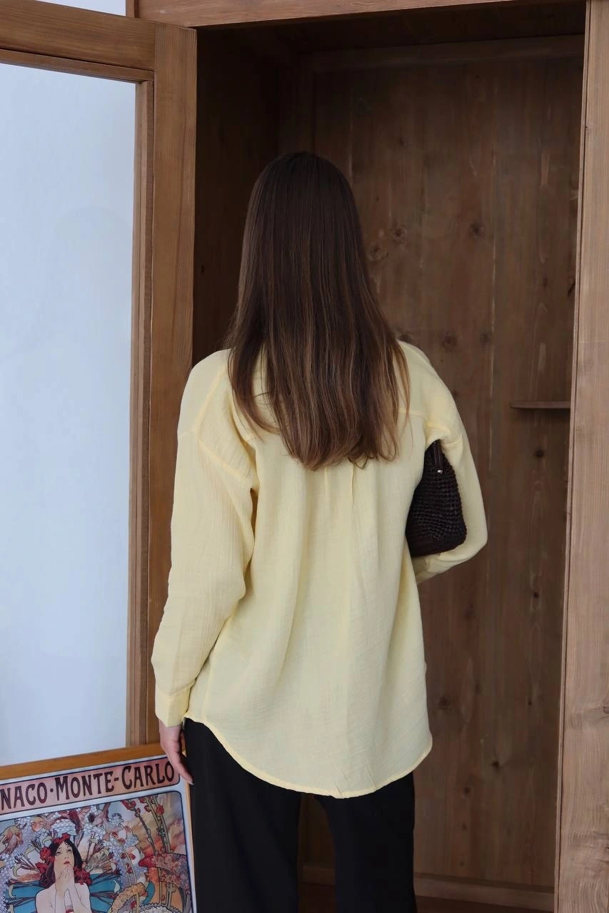 - Sarı rengiyle dikkat çeken gömlek, yaz aylarında ferah ve şık bir görünüm sunar.