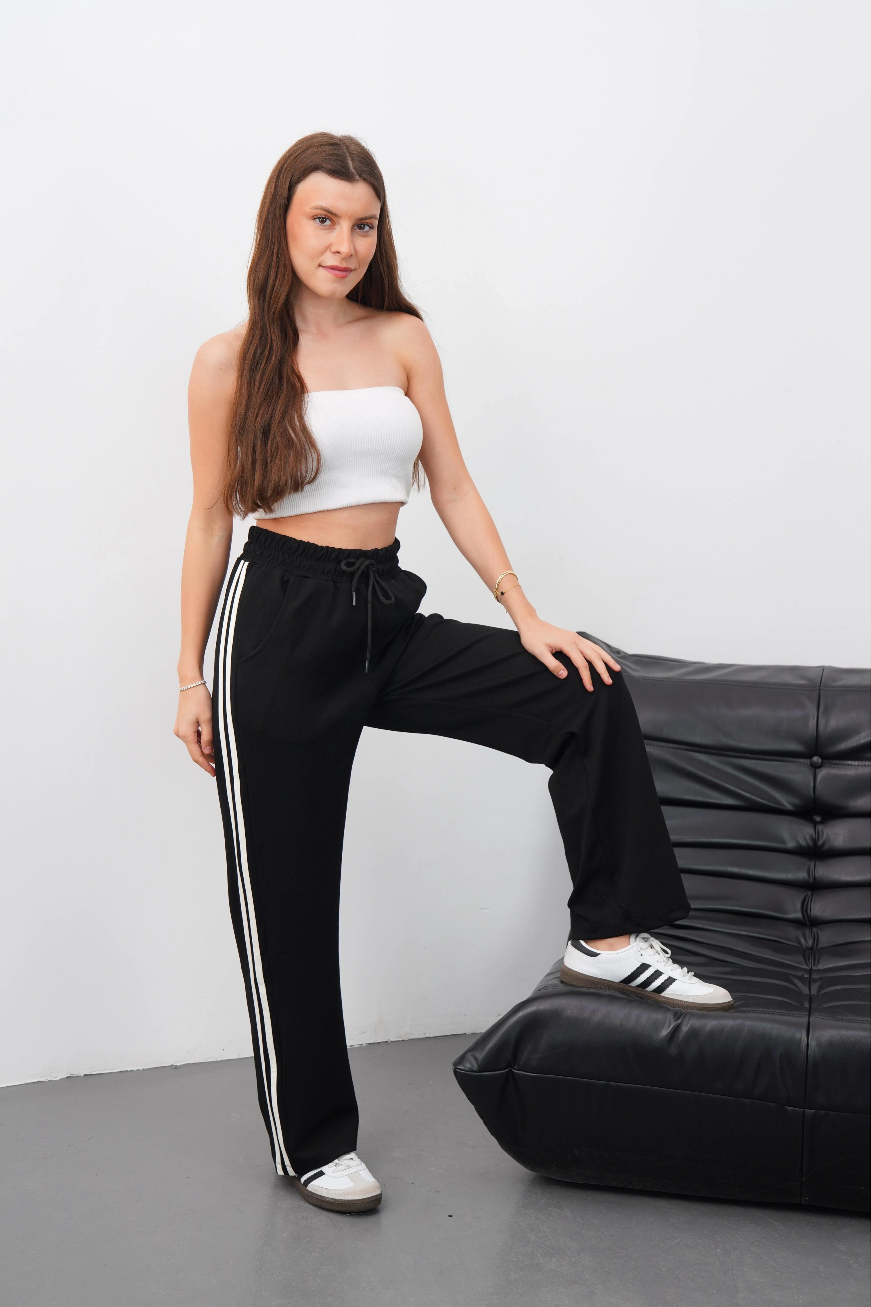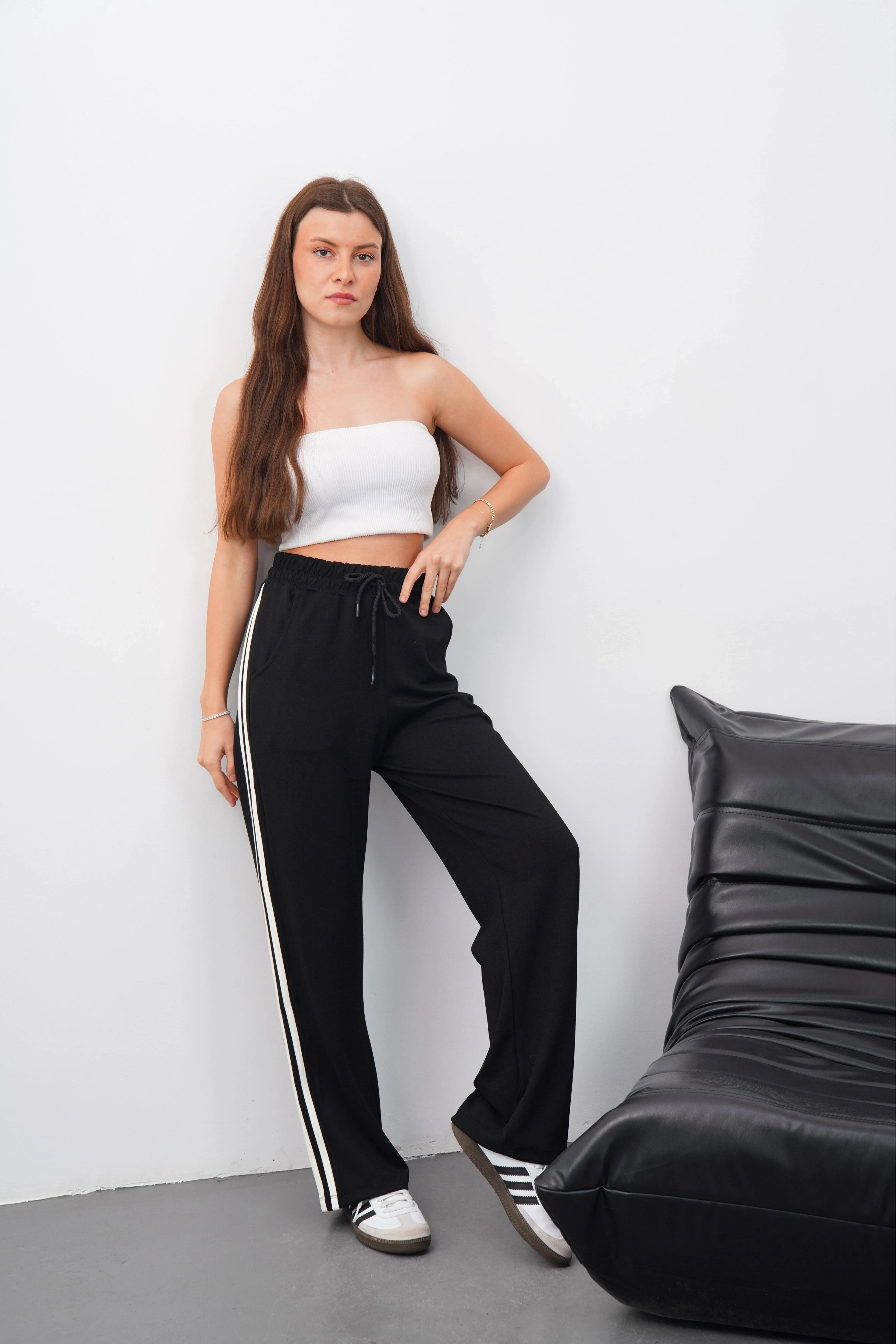 Yandan çift şeritli oys detayıyla öne çıkan siyah pantolon, gardırobunuzun vazgeçilmezi olmaya aday.