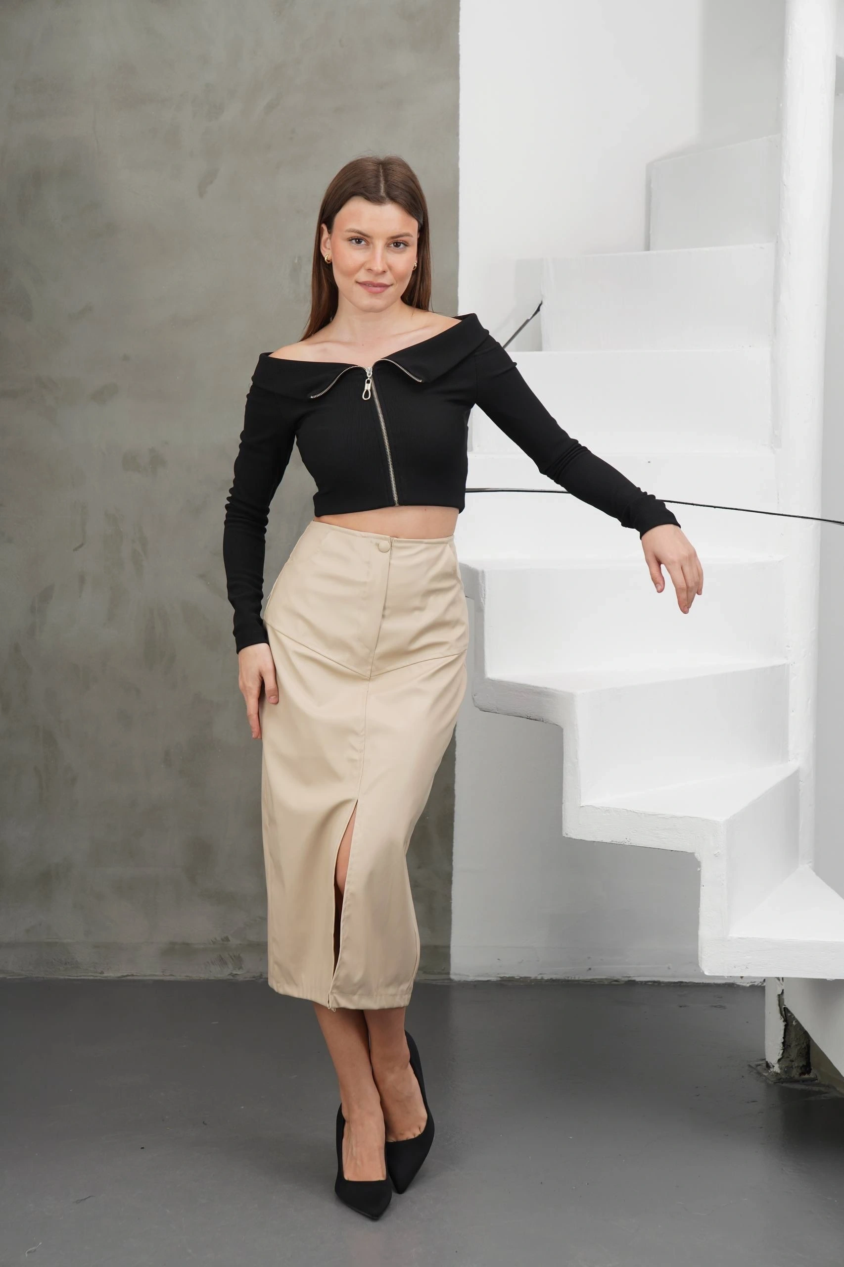 Şıklık ve tarzınızı ön plana çıkarmak istiyorsanız, Bej Yırtmaçlı Uzun Deri Eteği hemen sepetinize ekleyin!