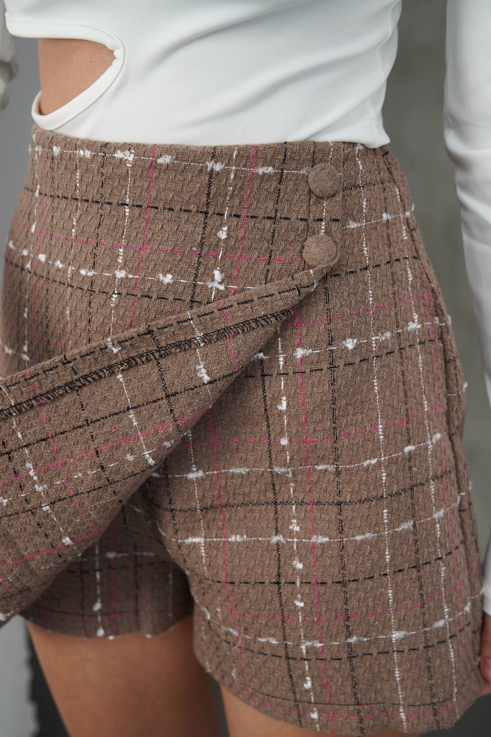 İki düğmeli şort etek vizon h26414, zarif ve şık bir tarzı seven kadınlar için ideal bir seçenektir.