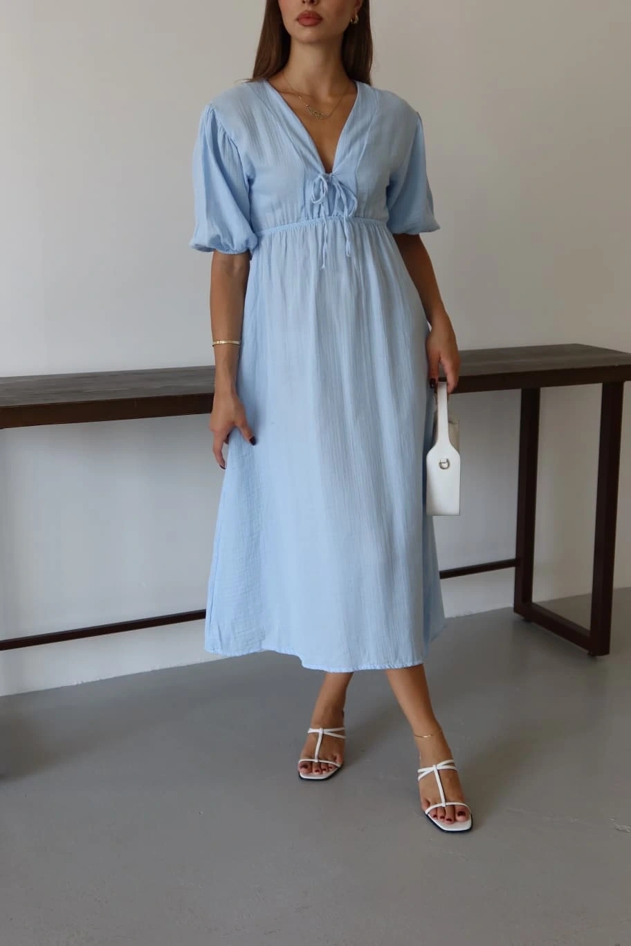 Şıklık ve rahatlık arayanların tercihi Kısa Kollu Müslin Elbise Mavi PT ile tarzınızı tamamlayın.