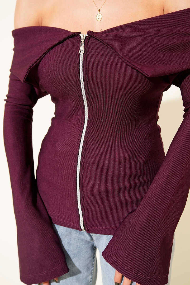 Omzu Açık Fermuarlı Bluz Mürdüm T4330, gardırobunuzun vazgeçilmezi olmaya aday!