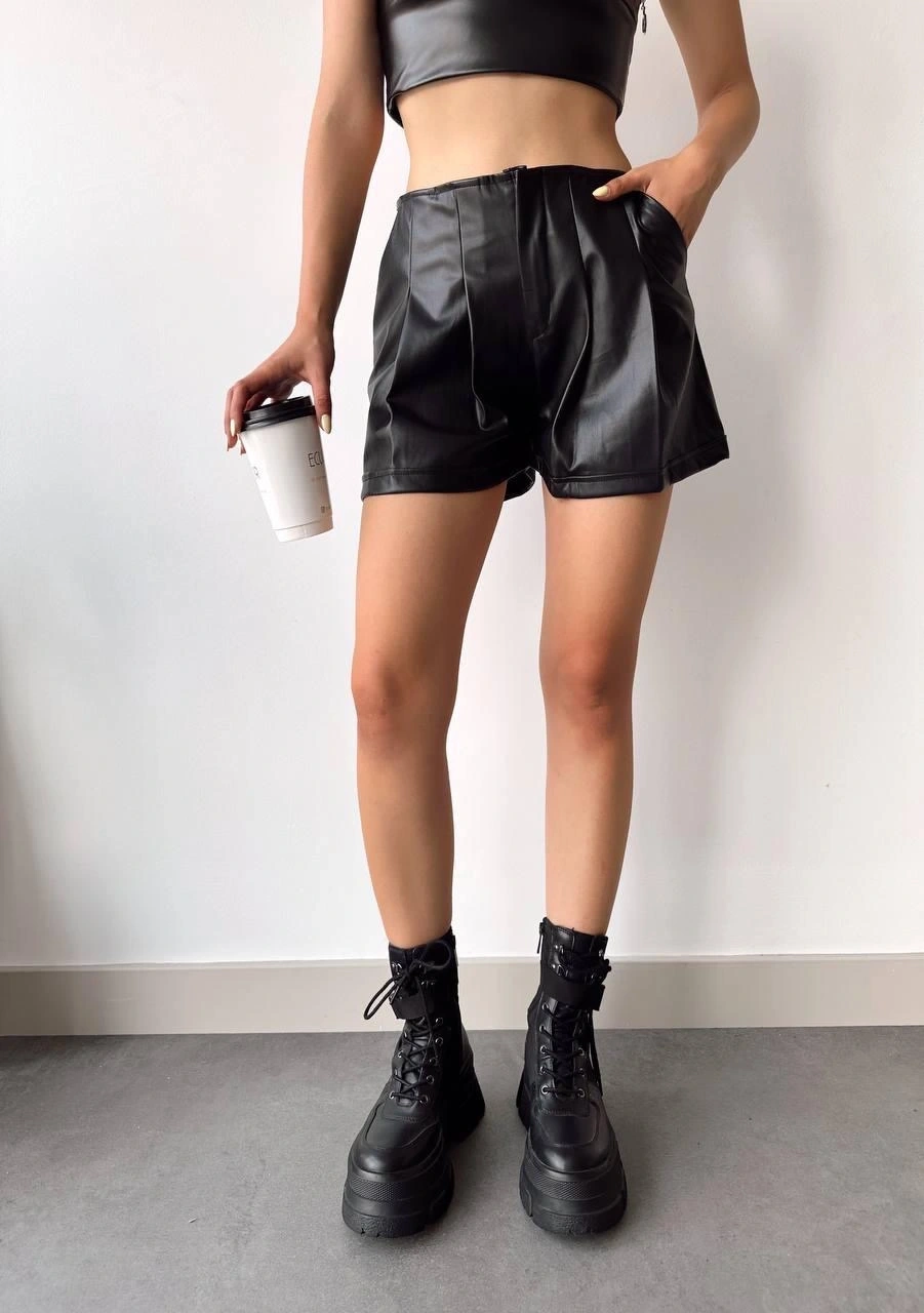 Şıklığıyla öne çıkan pileli deri şort siyah h240053, kadın giyim kategorisindeki favori parçalarınızdan biri olmaya aday!