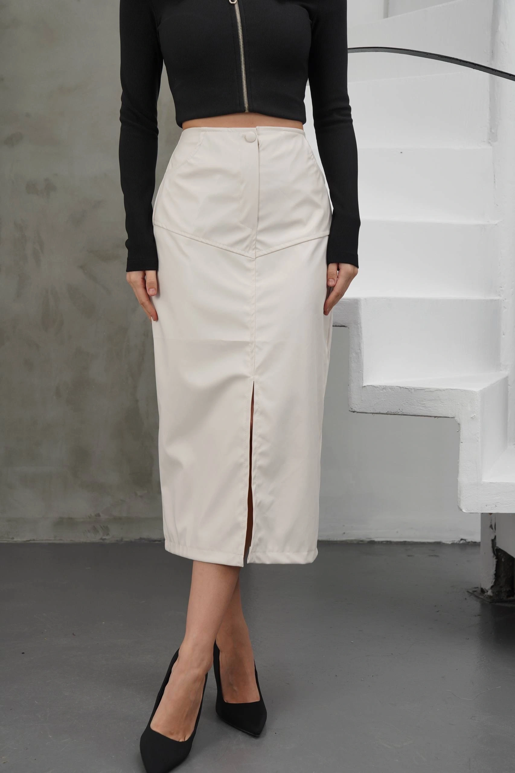 Yırtmaçlı uzun deri etek krem rengiyle gardırobunuza şıklık katacak bir parçadır.